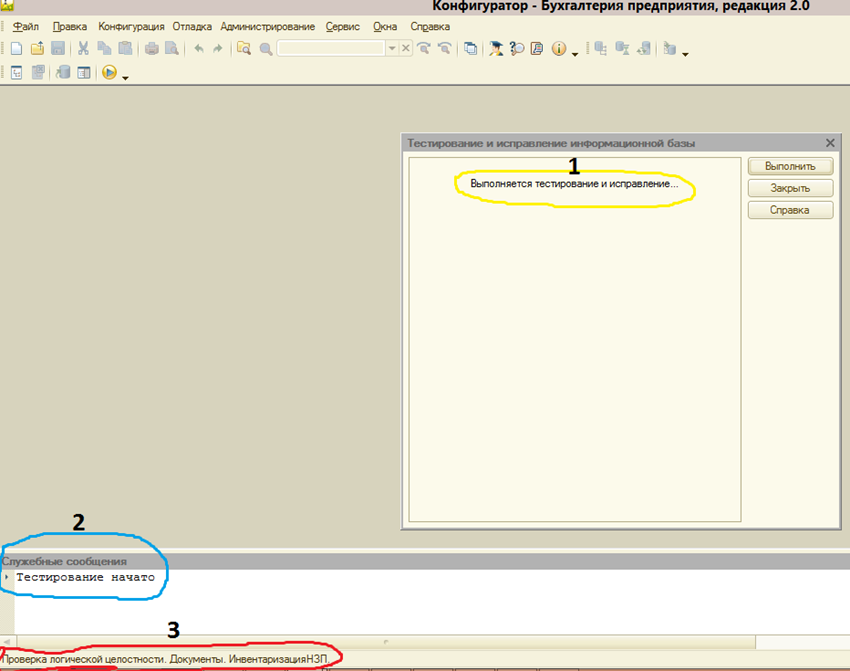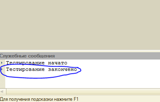 После окончания тестирования в служебных сообщениях появится запись: «Тестирование закончено», можно запускать базу в режиме предприятия (Рис. 5).